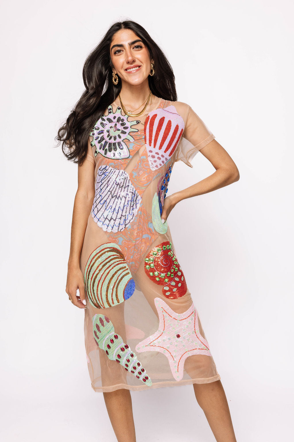 Elevate your beachwear with the Beige Multi Shell Coverup Midi Dress. Its lightweight fabric and elegant midi length offer effortless comfort and style. perfect for transitioning from sun-soaked days to casual evenings. The subtle shell pattern adds a touch of coastal charm. making it a versatile piece for your summer wardrobe.