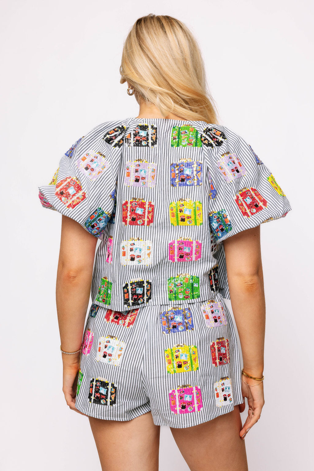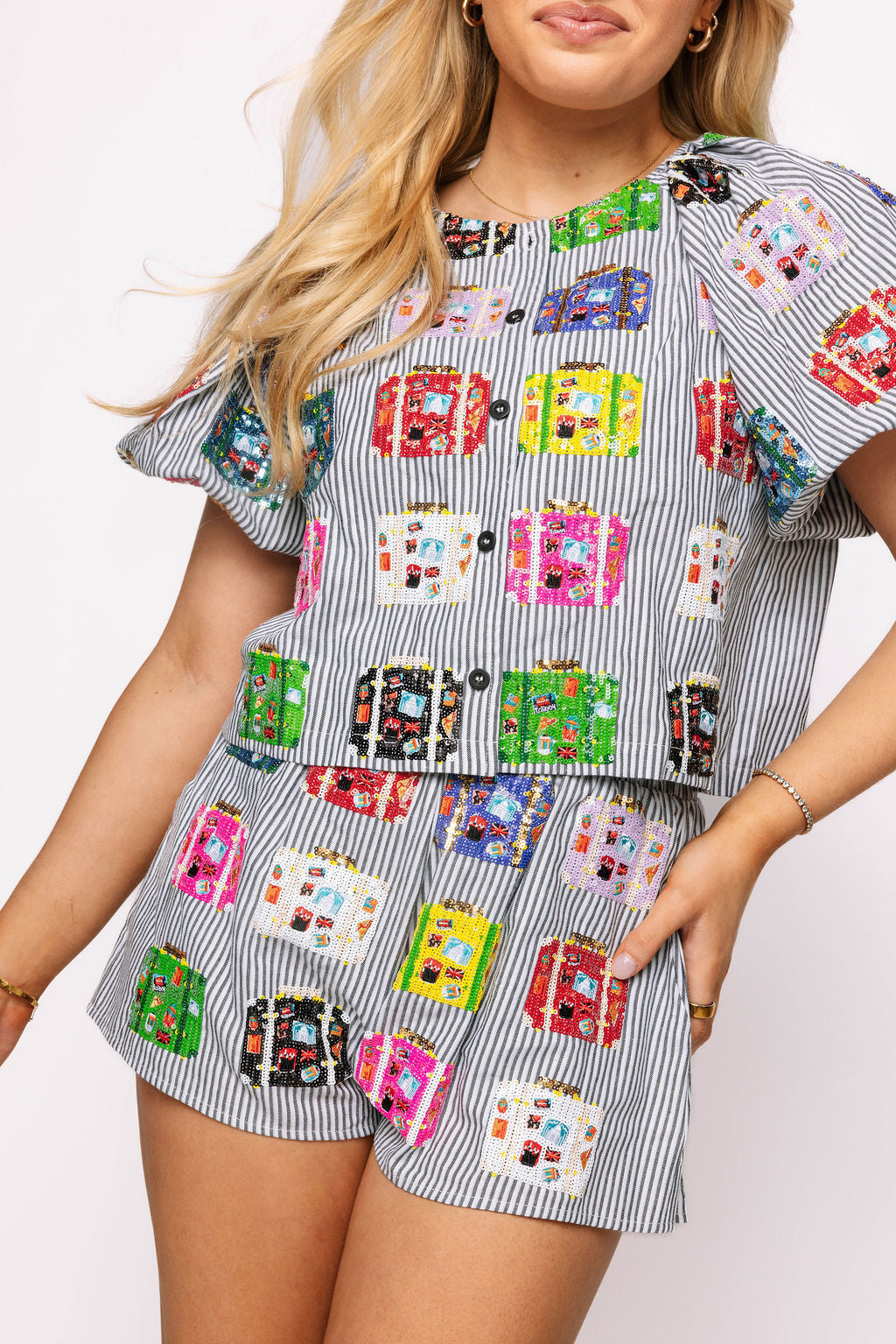 Make a statement this summer with our Black & White Stripe Multi Vintage Suitcase Cotton Shorts. Crafted from soft and comfortable cotton. these shorts feature a unique vintage suitcase design that is perfect for your summer trips. Stay stylish and comfortable while making memories in these cute shorts.
