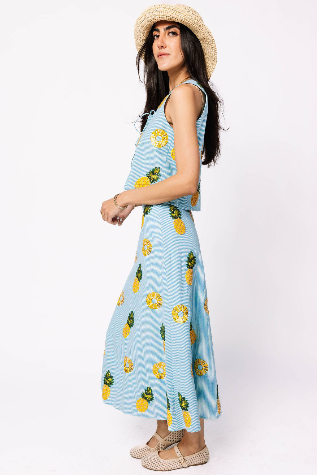Get ready to bring on the tropical vibes with the Blue & White Striped Pineapple Tie Tank! This stylish tank features a tie front for an adjustable and airy fit. perfect for those warm summer days. Pair it with the matching skirt for the full look and get ready to turn heads!