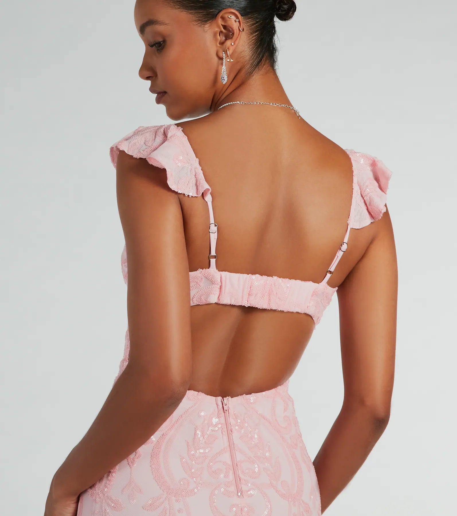 Glittery sequins add undeniable shine to the Estella long formal dress perfect for prom or black-tie occasions! With a mesmerizing sequin scroll pattern on delicate mesh fabric. this gown is sure to receive many compliments. The V-neckline and padded bra cups provide a flattering fit. while the ruffle trim adjustable spaghetti straps and open back add an eye-catching detail. The column silhouette and high front slit create a stunning. figure-hugging look that captures all the attention.