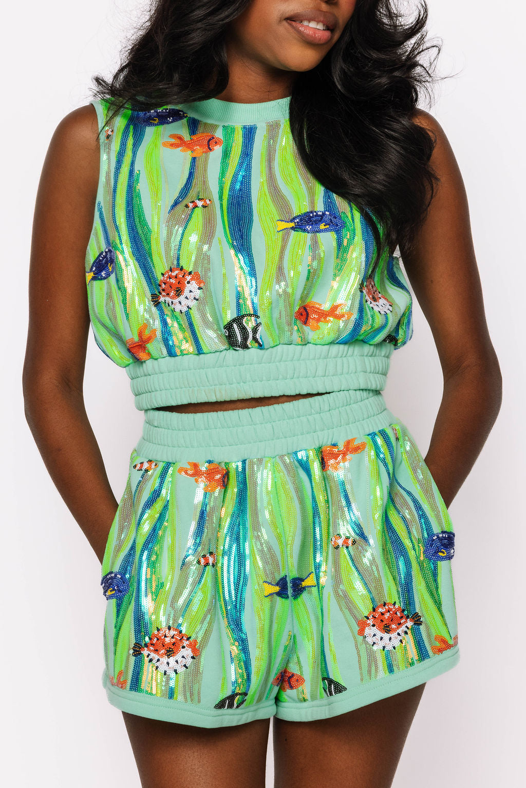 Dive into summer with our Green Multi Sequin Fish Underwater Tank! Full of colorful sequins. this tank is perfect for any warm weather occasion. Complete the look with our matching shorts for a stylish and fun outfit. Don't miss out on making a splash with this eye-catching ensemble!