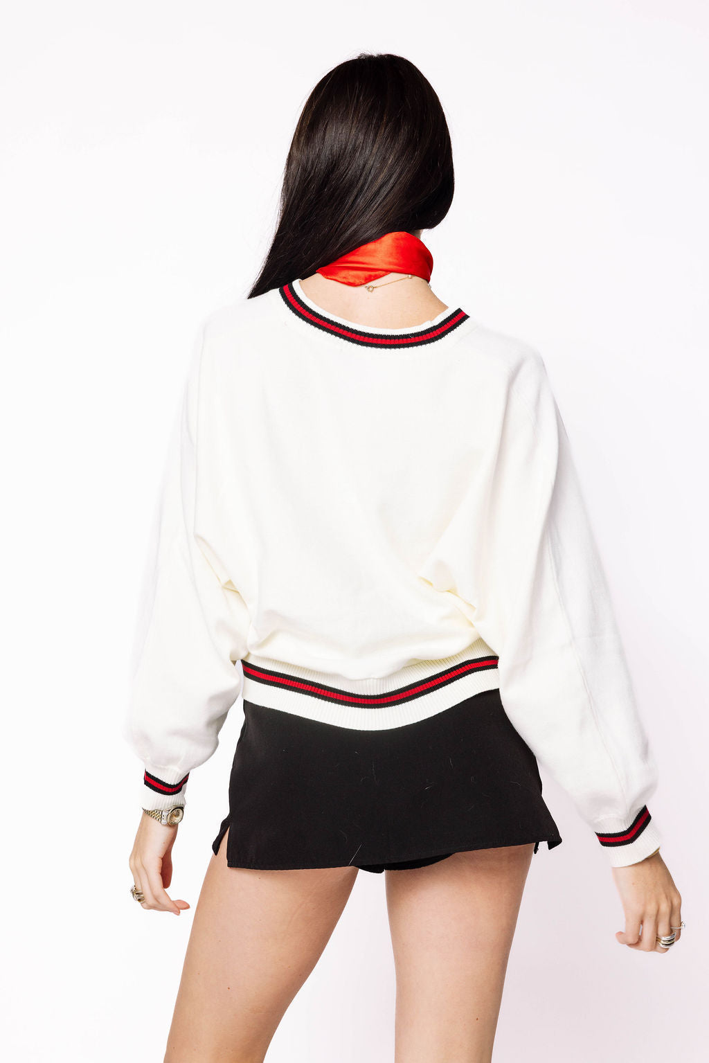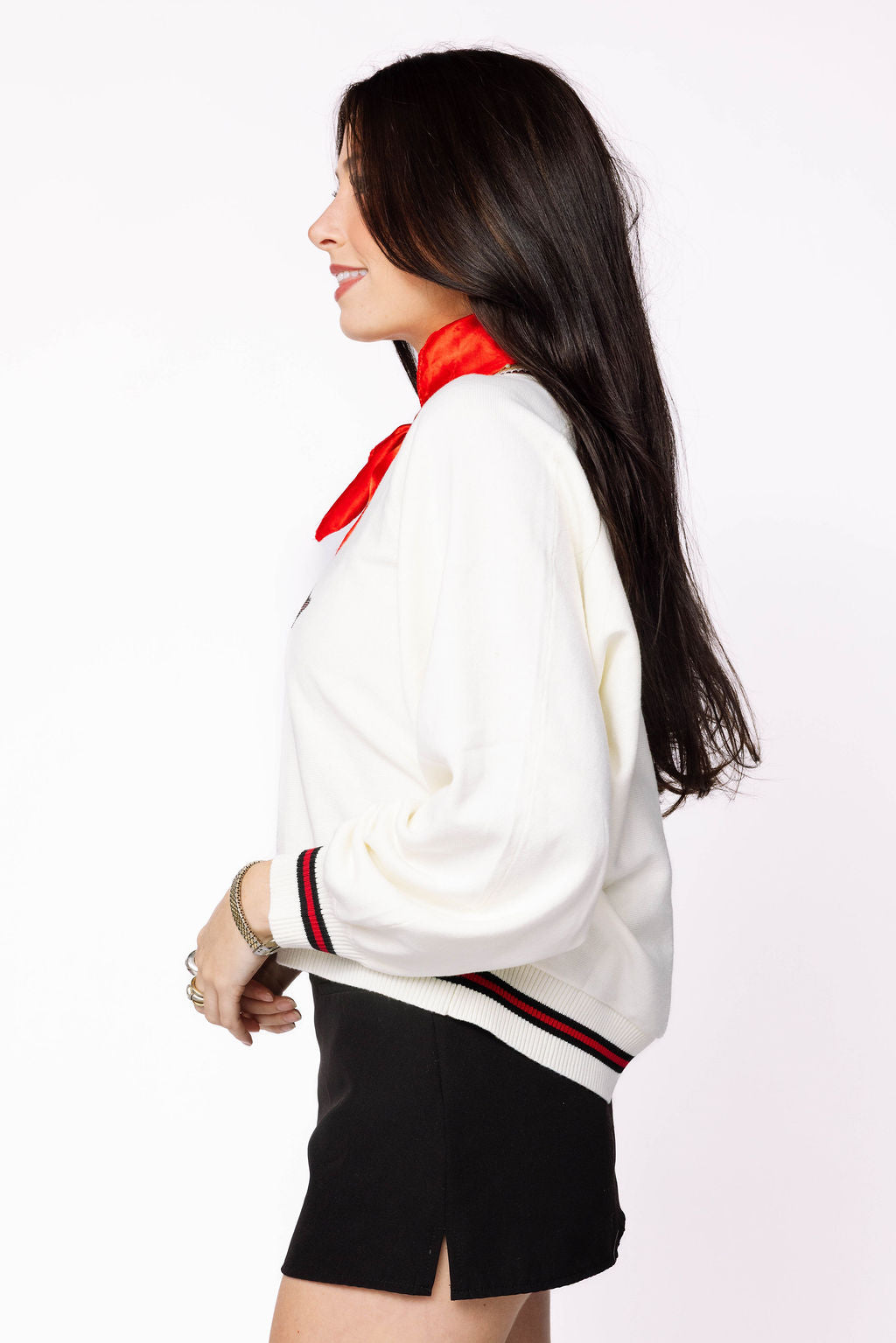 Embrace timeless style with this vintage-inspired white sweater featuring a subtle sequin Arkansas Razorback mascot. The V-neck and striped cuffs add classic charm. making it perfect for showing team pride with a touch of elegance. Comfortable and eye-catching. this sweater elevates your game day wardrobe effortlessly.