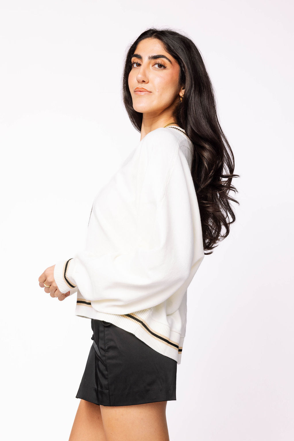 Stay cozy and show off your Army pride with this playful V-neck sweater. Featuring stylish striped cuffs and a small. charming mascot detail. it's perfect for casual days or cheering from the sidelines. Soft and lightweight. this long-sleeve sweater combines comfort with spirited style effortlessly.