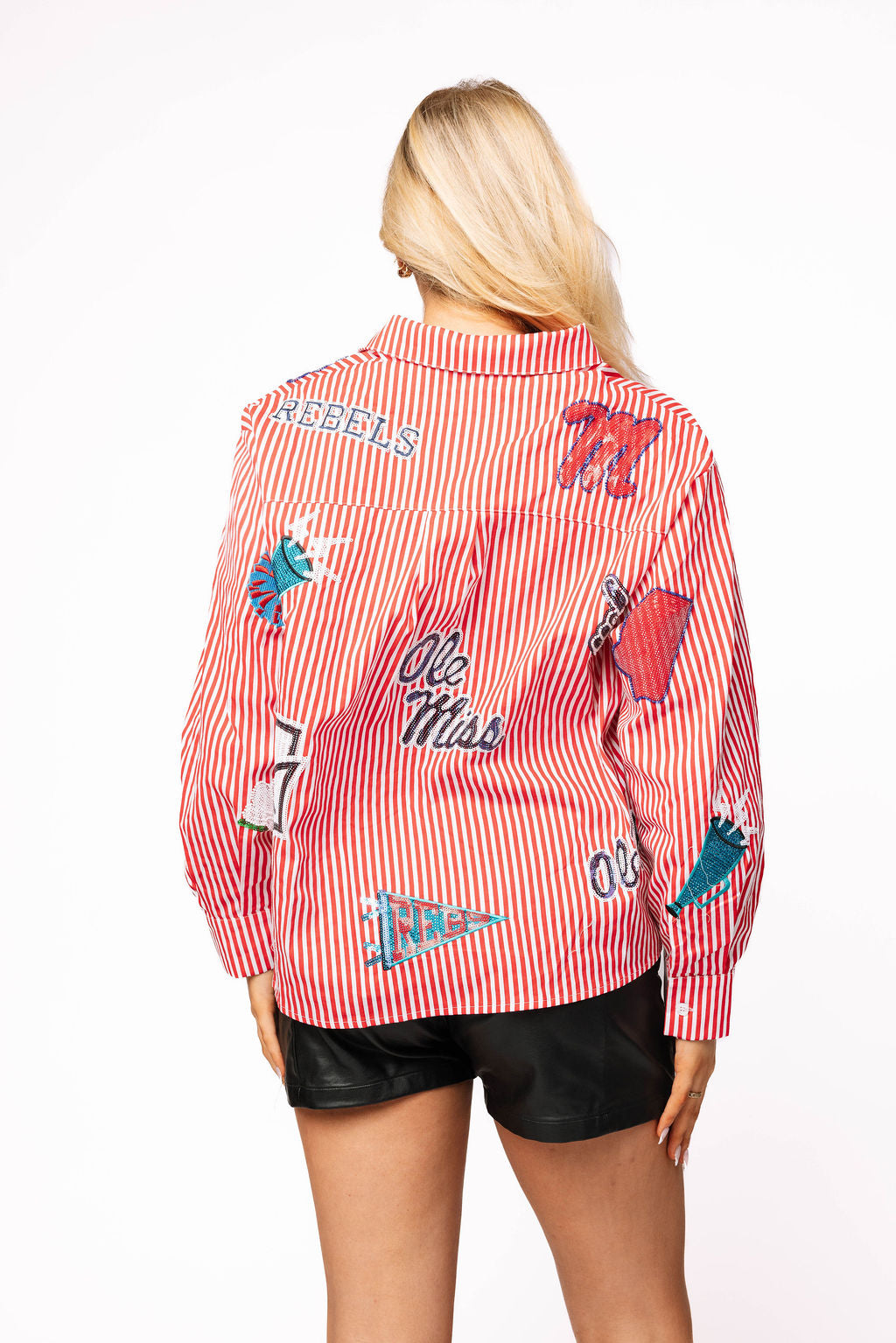 Show your Ole Miss pride in a fun way with this Licensed Ole Miss Mini Icon Striped Button Down. Featuring a playful striped pattern dotted with mini Ole Miss icons. this shirt adds a spirited touch to your game day outfit. Its classic button-down style keeps you looking sharp whether you're cheering in the stands or out with friends. Comfortable and casually cool. it's perfect for fans who love a bit of whimsy with their team spirit.