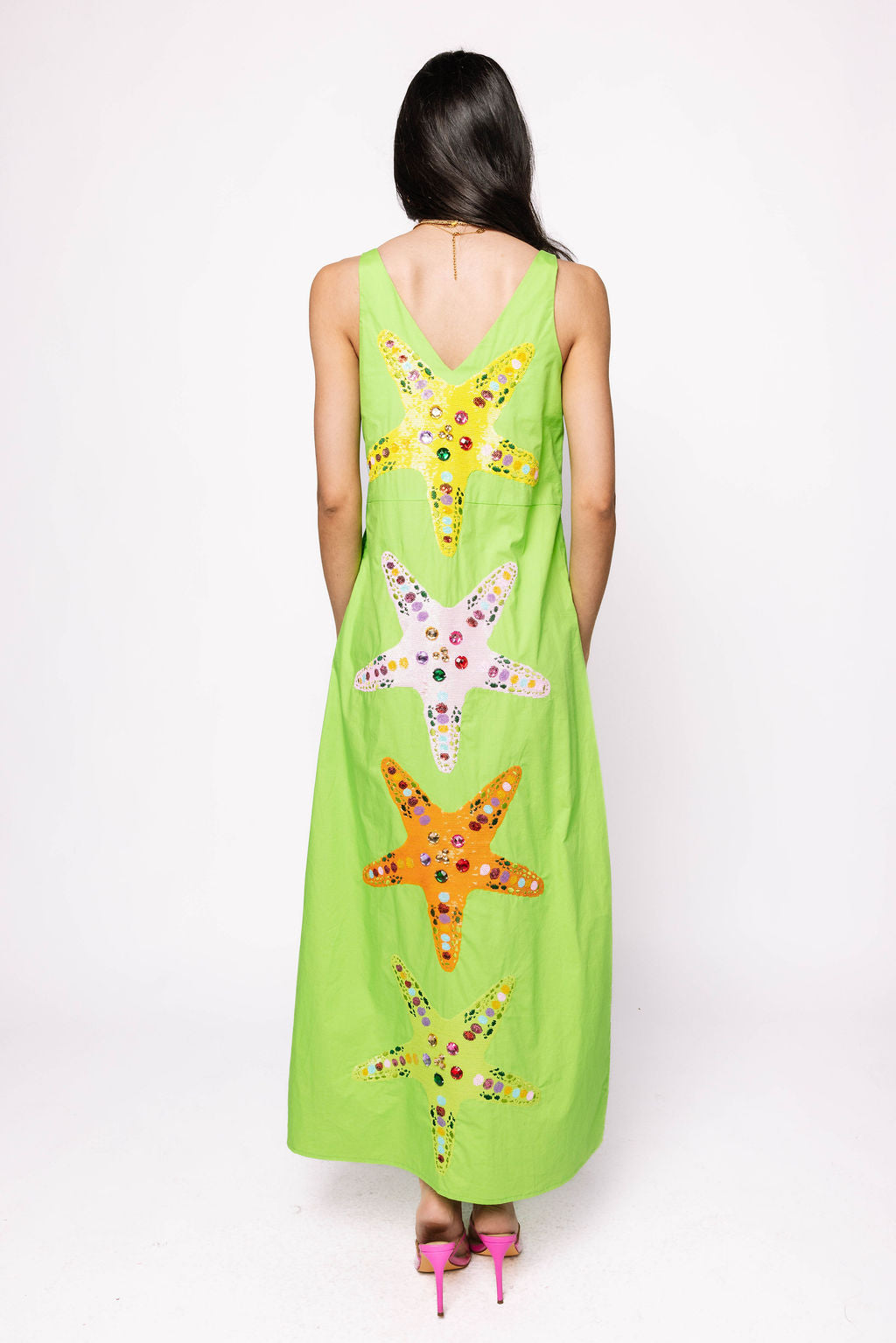 Indulge in the stunning beauty of our Lime Green Multi Star Fish Midi Cotton Dress! Made with soft. breathable cotton and adorned with sparkling jewels. this dress will keep you comfortable and stylish all day long. Stand out from the crowd with its vibrant lime green color and eye-catching star fish design. Perfect for any occasion. this dress will make you feel confident and beautiful. Don't miss out. add it to your wardrobe now!