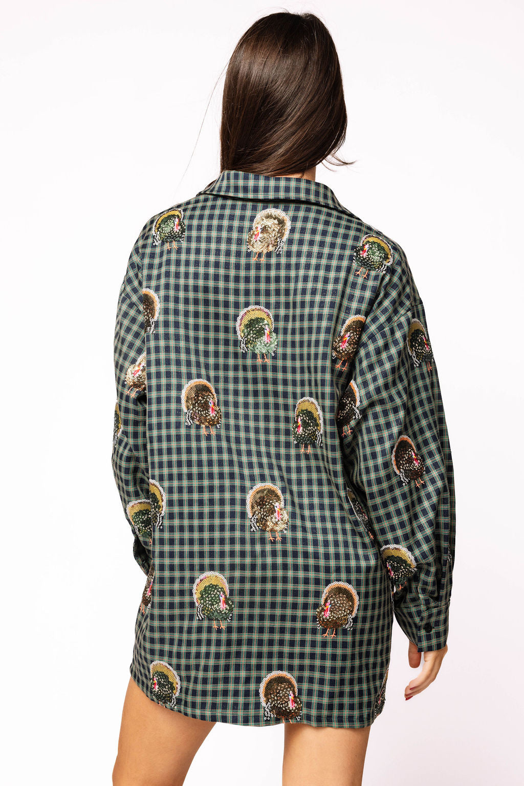 This Navy Plaid Scattered Turkey Button Up Dress brings a fun twist to classic style. With its charming turkey print scattered across cozy navy plaid. it's perfect for festive days or casual outings. The button-up design adds a flirty flair. making it easy to wear and layer. Embrace autumn vibes with a dress that's as playful as it is comfortable!