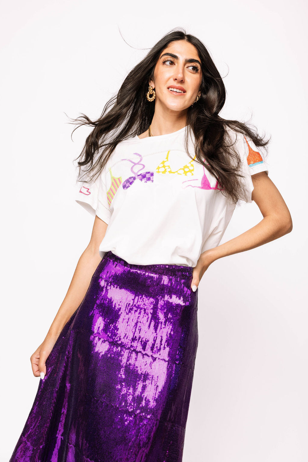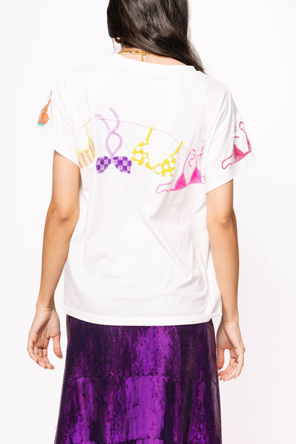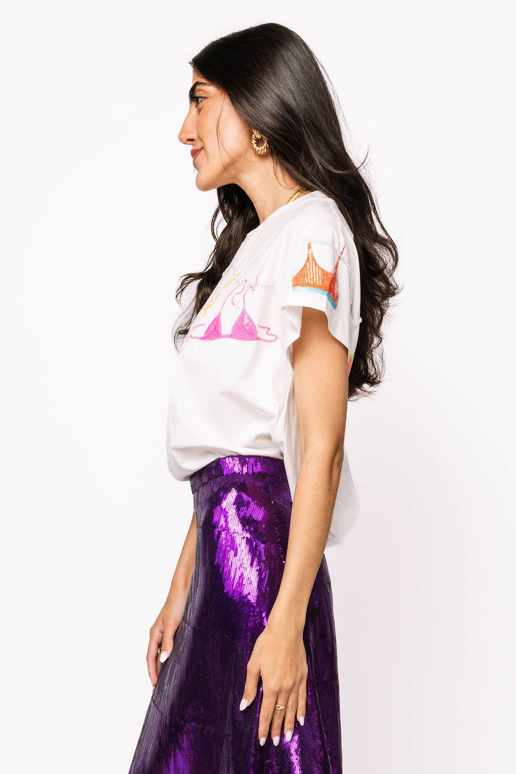 Get ready to shimmer in the sun with our White Multi Hanging Bikini Tee! This lightweight tee features a stunning white multi sequin bikini hanging on a pearl rope. Stay stylish and comfortable on the beach or by the pool in this must-have statement piece.